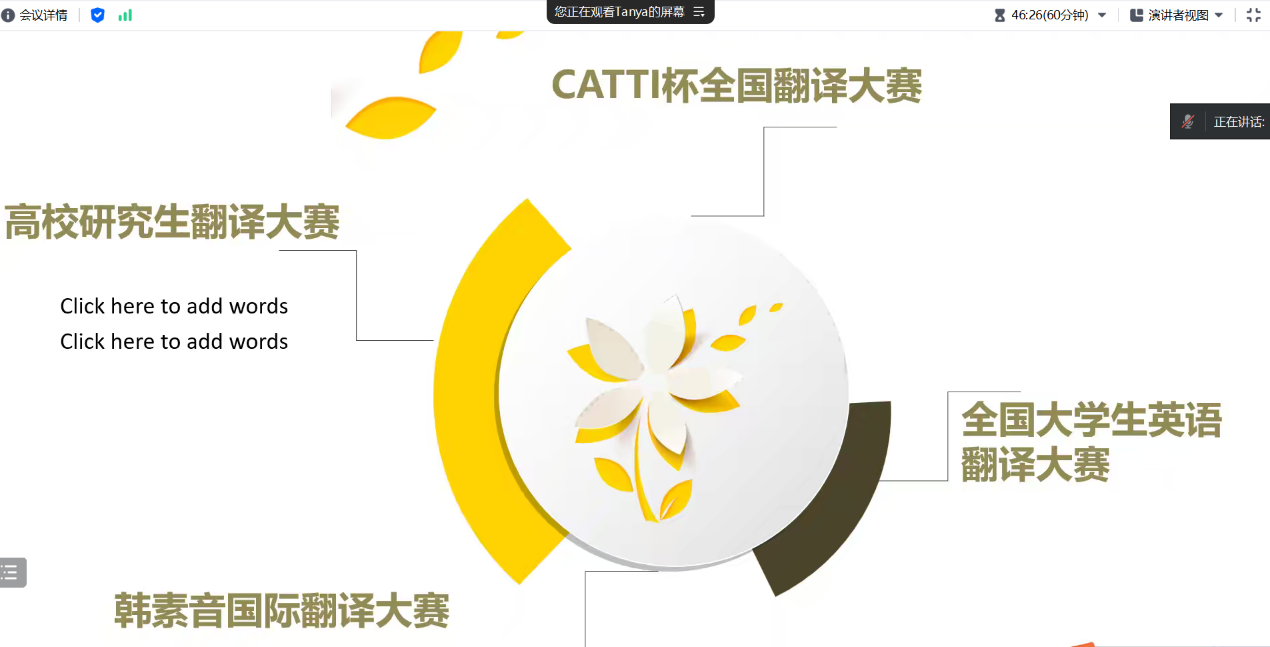 唐瑛从译心、译艺、译考、译赛这4个方面为同学们全面讲解了如何提高自身的翻译实践能力。对于译心,唐瑛强调要始终保持对翻译的热爱,并借用余光中先生的例子向同学们具体分析了如何培养和保持译心,即应培养持续学习的恒心、细节至上的细心、不怕困难的耐心、文化尊重的包容心以及事业追求的事业心。对于译艺,唐瑛强调应把翻译当作艺术一样去雕琢和培育,并号召同学们应从以下这4个方面来提高自身的翻译实践能力:首先,深化语言基础,应广泛阅读多元化的文本来提高精通双语的能力,比如坚持每天阅读一篇外刊文章。其次,坚持理论学习,应学习并理解不同的翻译理论,以便在翻译实践中灵活运用,且应通过研读优秀译者的翻译作品,分析其中的翻译策略与技巧等,从中汲取经验。再次,坚持技能训练,要针对不同类型的文本进行专项翻译练习,在追求翻译准确性的同时也要追求翻译速度。最后,培养文化意识,应深化对不同文化差异的理解,在翻译时要注重文化元素的传递和适应。对于译考,唐瑛鼓励同学们积极参加像Catti这一类的权威考试,从而去提高自身的专业水平。对于译赛,唐瑛号召同学们多多参加各类翻译大赛,如高校研究生翻译大赛和韩素音国际翻译大赛等,以赛促学。
