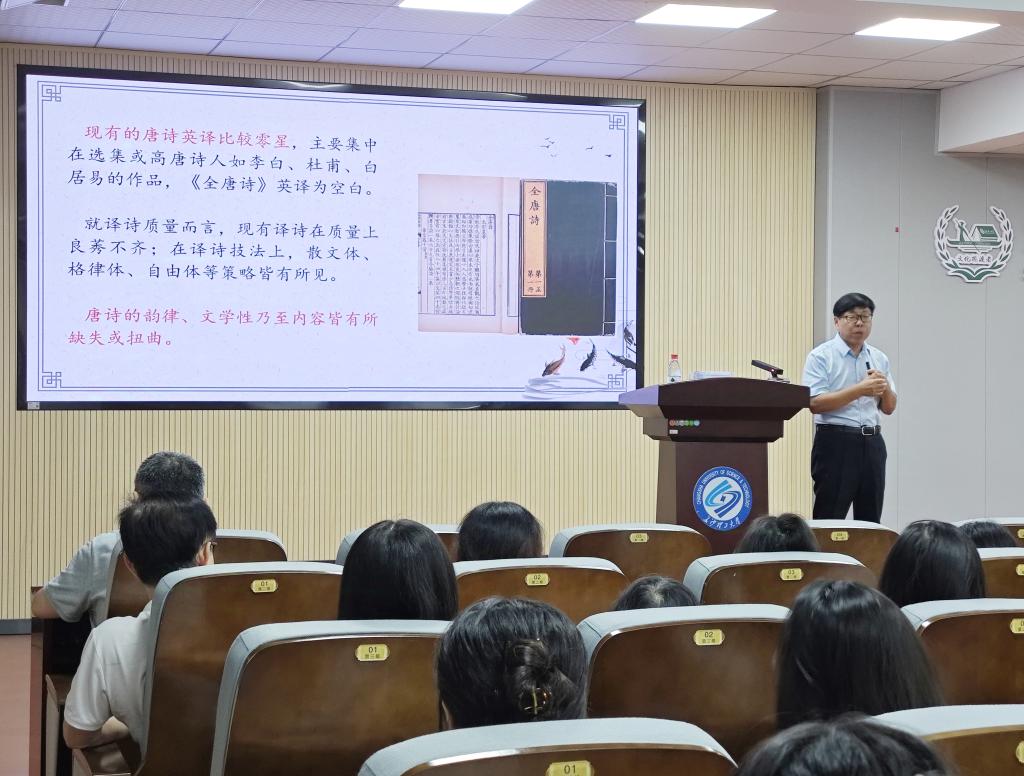 9月29日下午4点,永利集团88304官网外国语学院特邀上海大学赵彦春教授于金盆岭校区3教321报告厅为师生开展学术讲座,主题为“《全唐诗》英译原则与方法”。此次讲座由刘彬副院长主持,段胜峰院长、学院科研骨干、研究生等百余名师生参加。