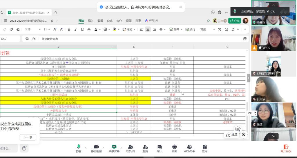 为了保障新学期研究生工作的稳步进行。2月26日下午15:30,外国语学院于线上召开了2024级研究生会第三次部门负责人会议。本次会议由院研会轮值主席易佳仪主持,全体部门负责人参会。