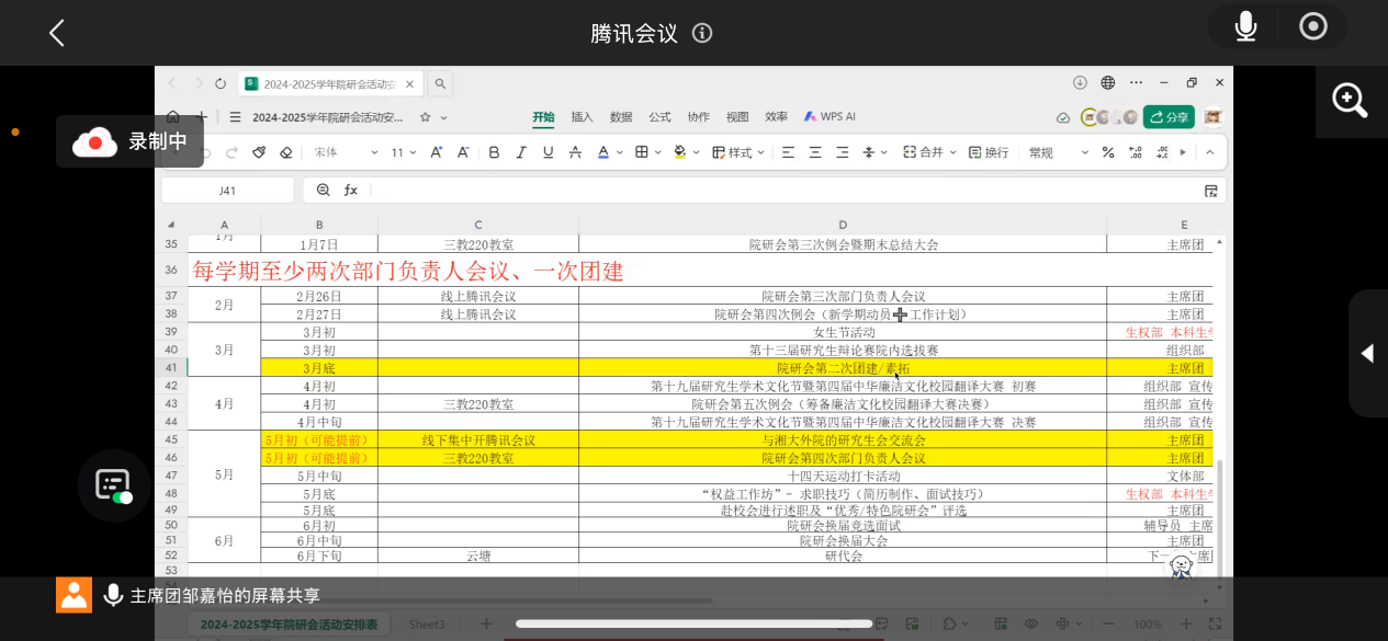 会议伊始,邹嘉怡详细介绍了本学期研会的各项工作安排,明确了本学期的工作主线,特别强调了“优秀/特色院研会”评选工作的重要性。她表示,评选不仅是对过去工作的总结,更是对未来发展的激励。各部门需严格对标评选标准,细化落实责任分工,以评促建、以评促优,全面提升院研会的整体服务水平。同时,她号召全体研会干部扎实推进各项工作,确保在评选工作中取得好成绩。