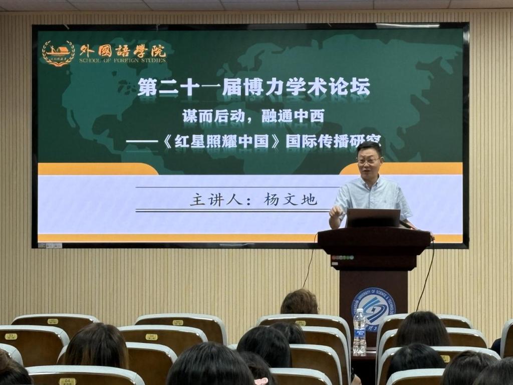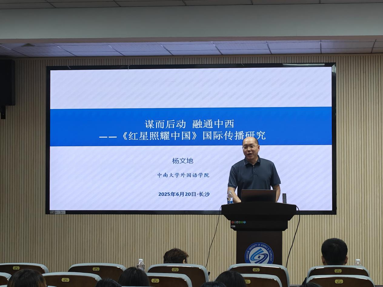 6月20日上午9点,永利集团88304官网第二十一届研究生博力学术论坛外国语学院专题论坛学术讲座在金盆岭校区三教321报告厅顺利举行。本次讲座主题为谋而后动,融通中西——《红星照耀中国》国际传播研究,由中南大学外国语学院院长、博士生导师杨文地教授主讲,外国语学院副院长姚尧担任主持人,众多师生参会。