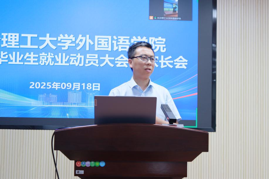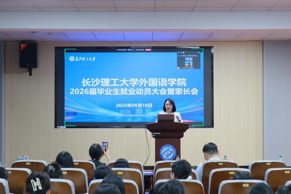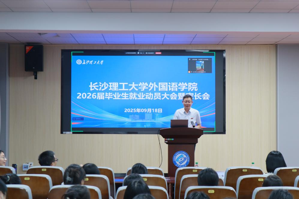 为更好地帮助毕业生把握就业形势,积极应对就业挑战,外国语学院于9月18日下午19:00在3教321报告厅召开了2026届毕业生就业动员大会暨毕业生家长会学院党委书记陈仁凯主持,院长段胜峰、学院党委副书记周芳以及就业专干武巧琳出席,全体2026届本科和硕士毕业生参会,毕业生家长于线上观看视频直播。