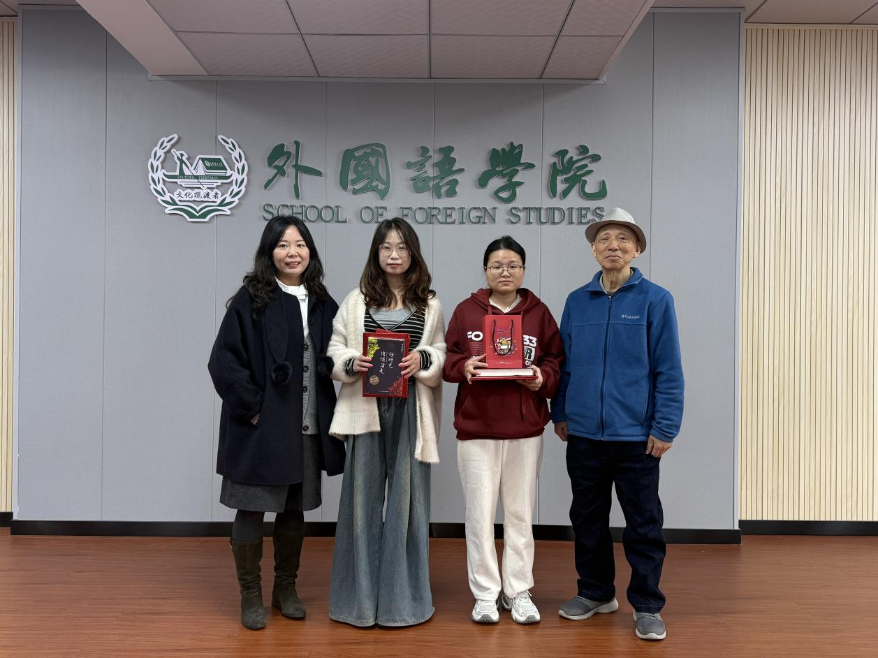 仪式伊始,郑延国以“文化摆渡勤精劲 锦绣文章爱国心”为主题展开了一场讲座,介绍了四位将爱国情怀融入翻译工作的作家。郑延国还将自己所著的《翻译纵横》赠与参会学生,鼓励新时代外语人当不畏险阻、勇毅前行,主动扛起文化交流的使命担当,努力成为连接中外文明的合格摆渡人。