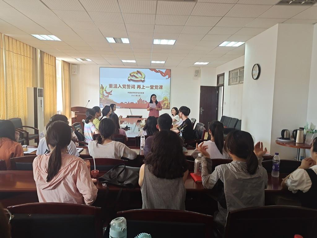 6月24日下午,外国语学院本科生党支部在云塘校区文科楼A区603会议室开展了以“再忆入党初心,重温入党誓词”为主题的党课,主讲人为院党委书记文丽丽,全体毕业生党员参加,党建辅导员袁媛主持。
