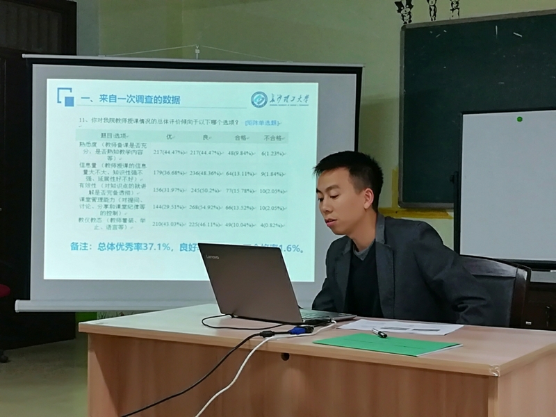 陈仁凯书记结合学生工作的实践,就支部工作、学工工作如何与本科生培养实现深度融合,详细阐述了他的思考和建议。陈书记首先展示了针对全院学生进行调研的多组数据,全面而详尽地介绍了学生对我院本科教学的评价。基于这些数据,陈书记总结了目前本科教学中存在的几个突出问题,如学生学习目标不明确,缺乏前景指导和方法指导等,并得出结论:要解决这些问题,构建育人共同体是必然选择。
