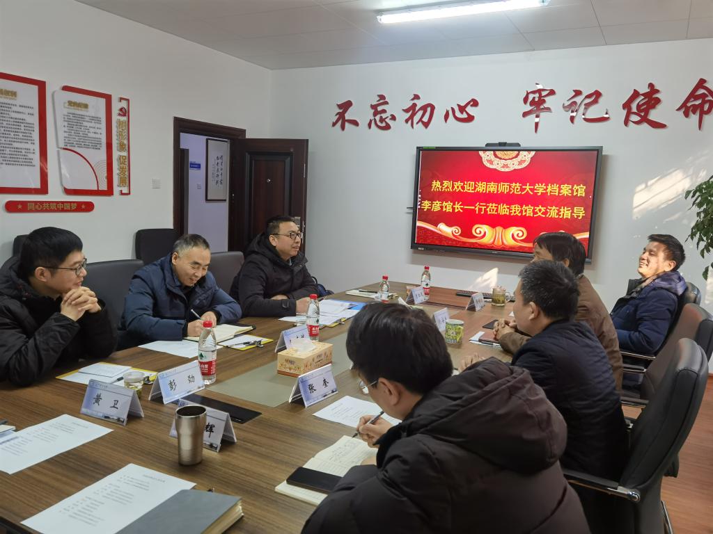 2023年12月21日下午,湖南师范大学档案馆馆长李彦、副馆长田支斌、技术部主任彭劲、管理利用部主任曾红凤一行来我馆调研交流。馆长刘安生、副馆长陈坤、周娇林及科室主任蔡焰辉、张奎、黄卫参加了此次调研交流活动。此次交流活动是档案馆整体搬迁工作完成、档案服务大厅投入使用后首次接待兄弟院校来访。