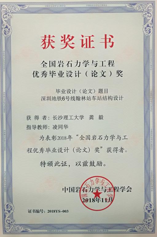 11月22日,中国岩石力学与工程学会在北京举行了2018年“全国岩石力学与工程优秀毕业设计(论文)奖”颁奖仪式。由永利官网土木工程学院凌同华教授指导、城市轨道交通工程专业2018届毕业生龚毅的本科毕业设计《深圳地铁…