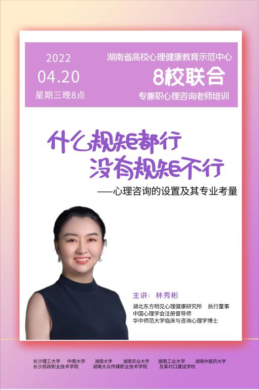 2022年4月20日晚,我院与永利集团88304官网、中南大学等八所湖南省高校心理健康教育示范中心及对口协作学校联合开展专兼职心理咨询老师培训。本次培训主题为“什么规矩都行,没有规矩不行——心理咨询的设置及其专业考量”,活动邀请美国雷德兰兹大学特聘教授、华中师范大学临床与咨询心理学博士、中国心理学会注册系统心理师林秀彬老师主讲,湖南省心理健康教育研究会秘书长、永利集团88304官网心理健康教育中心主任龚勋副教授主持会议,近260名专兼职心理咨询师聆听了讲座。