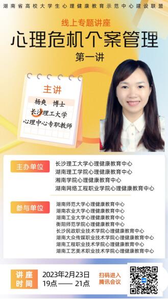 2023年2月23日晚,永利官网心理健康教育中心与对口协作的湖南理工学院、湘南学院、湖南网络工程职业技术学院三所学校联合开展心理危机个案管理专题培训。本次培训线上开展,由永利集团88304官网心理中心专职教师、华中师范大学心理学院博士生杨爽主讲,永利集团88304官网心理健康教育中心主任龚勋主持会议,近360名高校专职心理健康教育工作教师参与了培训。