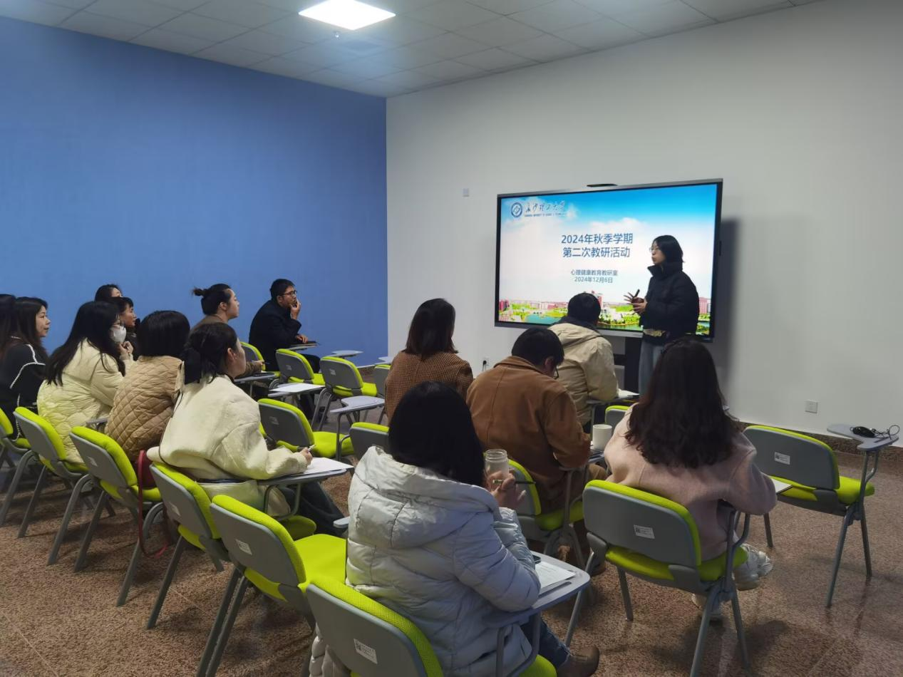 2024年12月6日上午9:30,永利集团88304官网心理健康教育教研室在团体辅导室举行了2024秋季学期第二次教研活动。本次活动由教研室主任卢灵舢主持,学工部副部长陶传谱和心理健康教育教研室全体老师参加。