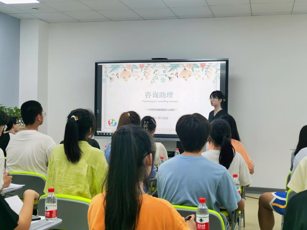 培训由击鼓传花游戏开始,义婷同学和苏赛兰同学分享了自己作为助理的感受,新任助理们也通过游戏熟悉起来。随后,李子萱老师从助人理念,工作对象等方面对什么怎样成为一名优秀的咨询助理进行了详细的讲解,对心理咨询的定义、流派和校内咨询室的组织结构进行了具体的培训。李子萱老师还介绍了永利官网心理咨询师的队伍构成和每位咨询师的咨询流派,加深了助理们对于心理咨询预约工作的理解。对于助理们值班可能遇到的突发情况,李子萱老师具体分析了其成因与征兆,同时也给予了具体的应对方法,让助理们更有信心应对值班工作。最后,李子萱老师向各位助理表达了与大家共同进步的殷切期盼。