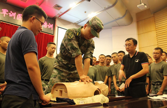 培训中,邱双发博士首先对心肺复苏术和气道异物梗阻的急救进行了理论讲解,然后运用人体模型,由刘继强博士现场配合,对心肺复苏的基本方法边演示边进行讲授,并指导永利官网带训教官分组进行实际操作演练,让带训教官对现场急救有了深入直观的学习,使其对基本急救的方法和技能有了更深的掌握,同时还指导学生对海姆立克急救法进行了演练。贺志飚博士和刘继强博士分别就热射病的早期识别和急救处理以及隐匿性代谢综合征并发症的急诊处理,用生动的语言,多媒体的授课形式,给永利官网师生作了细致的讲授。