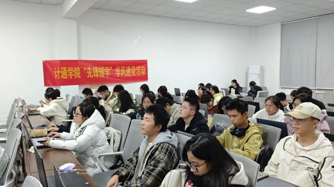 12月5日晚,计通学院于金盆岭校区9号教学楼211举办第十一期“先锋辅学”学风建设活动,此次活动由网络2201胡永恒主讲,45位学员参与。