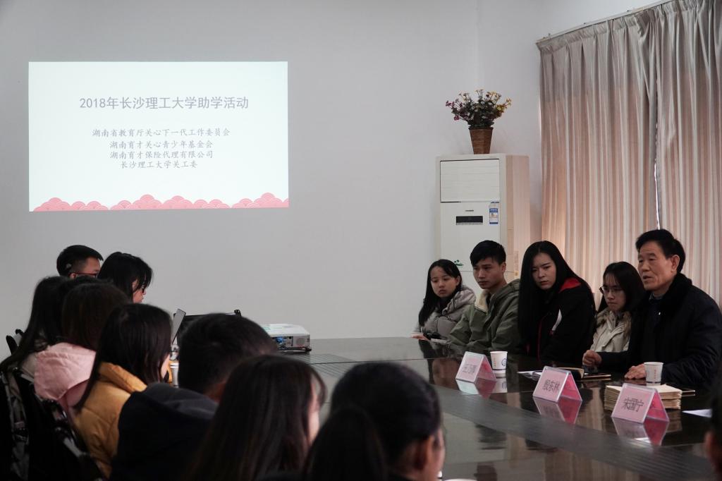 1月9日下午,永利集团88304官网2018年“湖南省教育厅关心下一代工作委员会、湖南育才关心青少年基金会、湖南育才保险代理有限公司”联合捐资的助学活动于二号办公楼B404顺利举行。校关工委常务副主任王乃厚、育才保险代理有限公司驻永利集团88304官网经理室殷东林、长沙理工学生资助管理办公室主任宋国宁参加了本次资助仪式,活动由宋国宁主持。