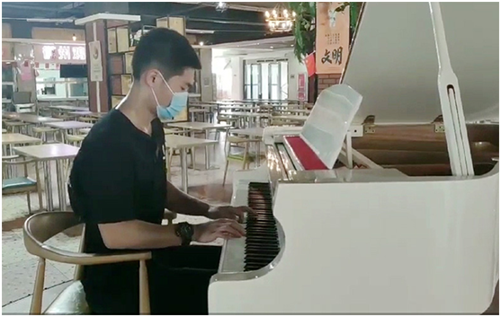 国际学院的左思明办完报到手续,放好行李,便跑进了汀香园,一曲悠扬的钢琴曲《穿越时空的思念》打破了寂静几个月的校园,他说:“离校130天,我思念学校的一草一木。”