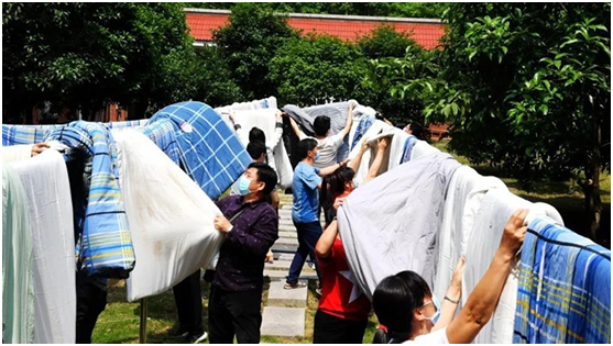 从3月份开始,学校宿舍管理中心近160名宿舍管理员到岗,每日要进行楼栋巡查,对公寓水、电、消防器材进行全面检查,对学生宿舍、洗衣房、饮水机、空调等进行打扫消杀等等。根据学生个性化的需求,宿舍管理中心还提供了订单式服务,近两个月晒被子超万床。