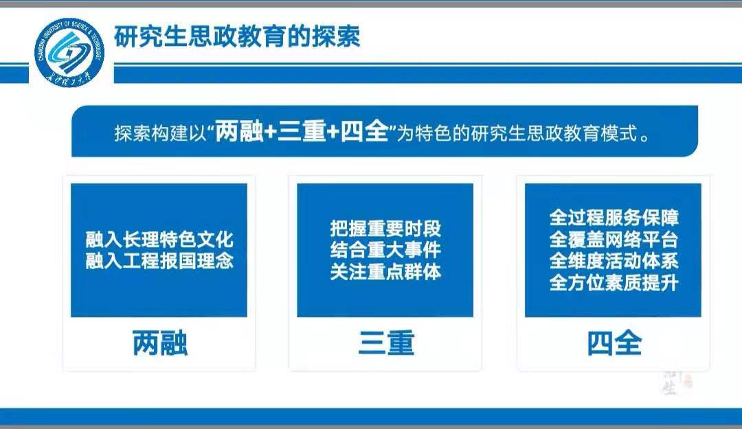 研究生院(党委研究生工作部)在学校党委的坚强领导下,深入学习贯彻全国研究生教育会议精神,落实“立德为本,夯基为根,刚柔并济,特色致远”的工作理念,坚持以“服务研究生发展,服务双一流建设”为宗旨,以“提升学术贡献率,增强认同感、归属感、自豪感,培养具有较强科研能力、鲜明长理特质的研究生”为目标,探索构建了以“两融+三重+四全”为特色的研究生思政教育模式,思想引领坚强有力,工作体系持续完善,服务水平显著提升,先进典型不断涌现,工作成效得到了广泛的认可。