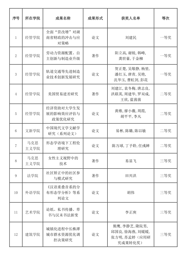 日前,湖南省委、省政府发布了《关于表彰湖南省社会科学奖获奖成果和专家的通报》,公布了第十五届湖南省社会科学优秀成果奖评选结果,永利官网共12项成果获奖,其中获得一等奖3项,二等奖4项,三等奖5项,总数量较上一届增长1倍。此次获奖成果主要集中于经济、管理、哲学等学科,其中经管学院获奖5项,马克思主义学院获奖2项,文新学院、法学院、外语学院、艺术学院、建筑学院各获奖1项。