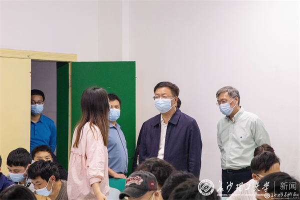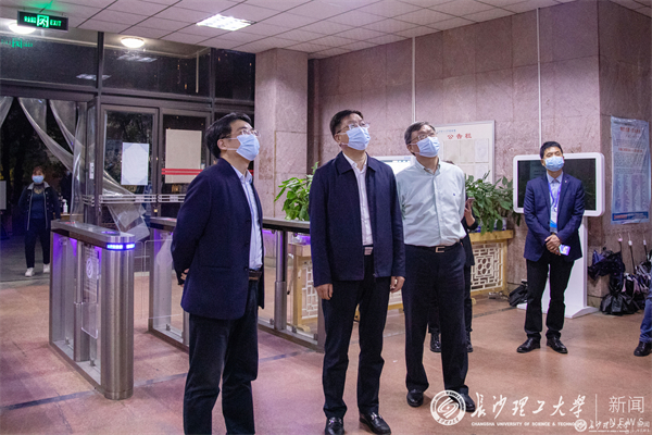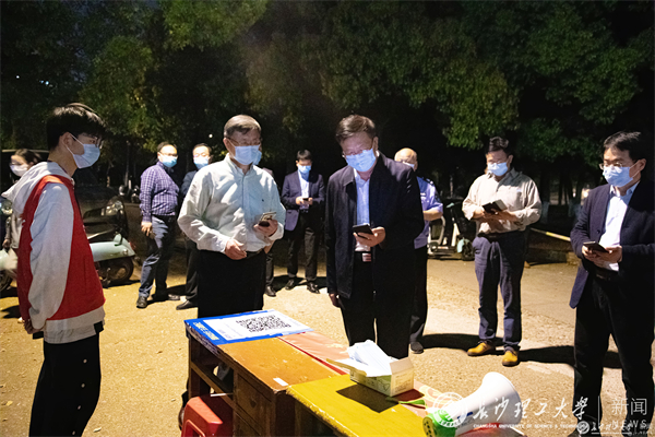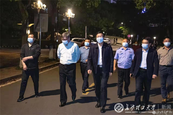 4月7日晚,校党委书记付宏渊,副校长谈传生、钱国平,带领学校党政办、防控办、宣传部、学工部(处)、保卫处、离退休中心、后勤中心、继教学院等有关单位负责人和疫情防控工作领导小组驻金盆岭办公室成员,先后深入金盆岭校区和云塘校区的运动场、教学楼、图书馆等地,检查校园疫情防控工作,看望慰问一线工作人员和师生志愿者。