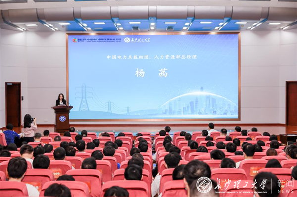 杨茜代表中国电力致辞。她对学校长期以来给予中国电力的大力支持表示感谢。她向长理学子发出诚挚邀请,期待更多的长沙理学子加入中国电力,共同致力于中国电力在2035年成为世界一流的绿色低碳能源供应商,与长理杰出校友共同打造中国电力的辉煌未来。王冬容从企业概况、常规能源项目、清洁能源主赛道、绿色能源新赛道、人才培养五个方面进行宣讲。