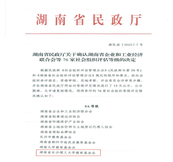 近日,湖南省民政厅发布2022年度省管社会组织评估等级结果,“湖南省永利集团88304官网教育发展基金会”获评全省最高等级的“5A级社会组织”。今年全省有76家社会组织参评,其中获评5A等级社会组织的共21家,全省高校基金会仅两家。