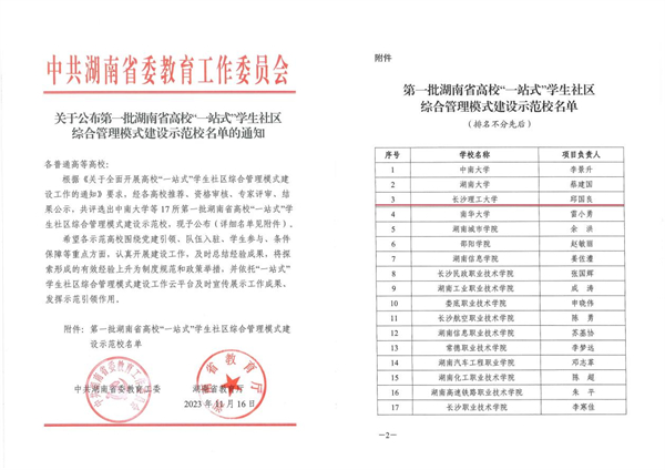 近日,中共湖南省委教育工委公布了第一批湖南省高校“一站式”学生社区综合管理模式建设示范校名单,共评选出17所建设示范校,其中本科院校7所,高职院校10所,永利官网成功获批为第一批“一站式”学生社区综合管理模式建设示范校。