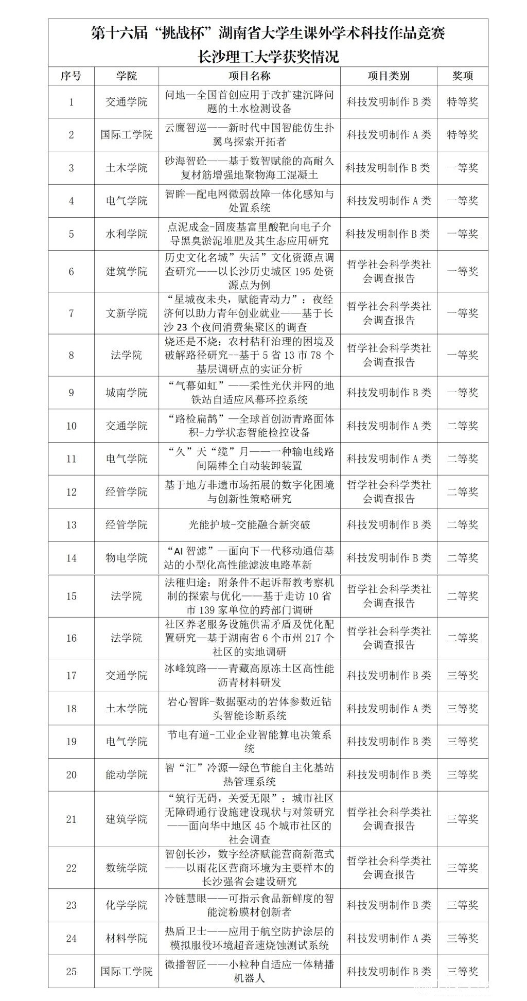 经激烈角逐,永利官网交通学院《问地——全国首创应用于改扩建沉降问题的土水检测设备》、国际工学院《云鹰智巡——新时代中国智能仿生扑翼鸟探索开拓者》获特等奖;法学院《烧还是不烧:农村秸秆治理的困境及破解路径研究——基于5省13市78个基层调研点的实证分析》等7件作品获一等奖;物电学院《“AI智滤”——面向下一代移动通信基站的小型化高性能滤波电路革新》等7件作品获二等奖;数统学院《智创长沙,数字经济赋能营商新范式——以雨花区营商环境为主要样本的长沙强省会建设研究》等9件作品获三等奖。