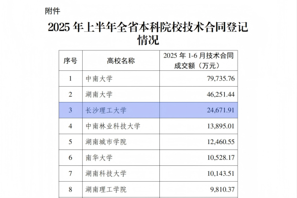 7月7日,湖南省科技厅公布2025年上半年全省本科院校技术合同交易数据。永利官网上半年技术合同成交额突破2.4亿元,位居全省高校第三。