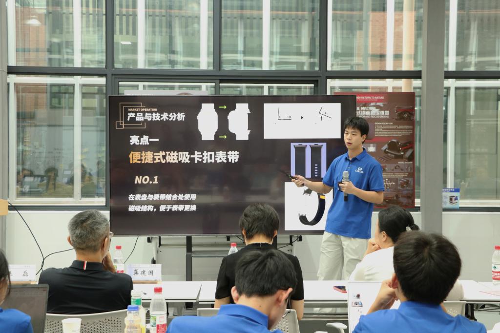 闭幕式上,5支项目团队依次登台,进行了精彩的项目展示与答辩。各团队聚焦智能穿戴设备领域的前沿需求与应用场景,展示了从需求洞察、方案设计到技术实现的全流程实践成果,项目覆盖健康监测、运动辅助、学习辅助、人机交互等多个智能化方向。“这款智能手环的续航方案是否考虑过与其他电子产品的互连?”“这款手表精准定位的目标群体是大学生还是中小学生?”……面对评委的提问,学员迅速调出模型和调研数据进行答辩,充分展现了青年学子的创新思维与技术攻坚能力,受到评委一致好评。