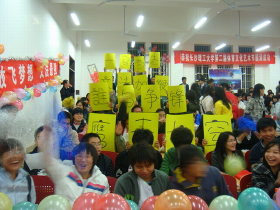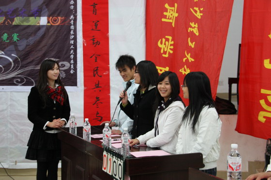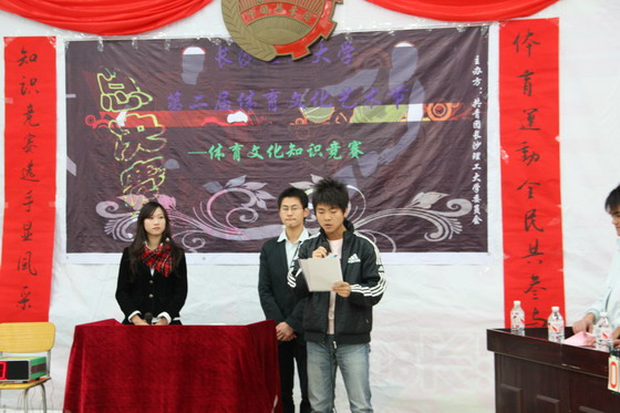 27日晚,文科楼B204教室里,团徽高悬,院旗飘扬,张灯结彩,一副“体育运动全民共参与,知识竞赛选手显风采”的对联引人瞩目,观众热情似火,掌声如潮。体育文化知识竞赛决赛在这里举行。