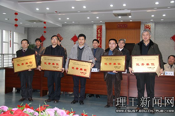 校长郑健龙宣读了《关于表彰2011年度优秀单位(部门)的决定》(长理工大人〔2012〕1号)。校领导为在院(部)目标管理综合考评中获“优秀”等级的土木与建筑学院、交通运输工程学院、经济与管理学院,在机关职能部门及教辅单位年度考评中获得优秀单位称号的招生就业处、人事处和党委组织部进行了颁奖。