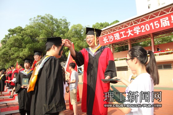 在欢快的音乐中,与会校领导、各学院的教授代表为获得学位的毕业生一一颁发学位证书、挑苏留影。