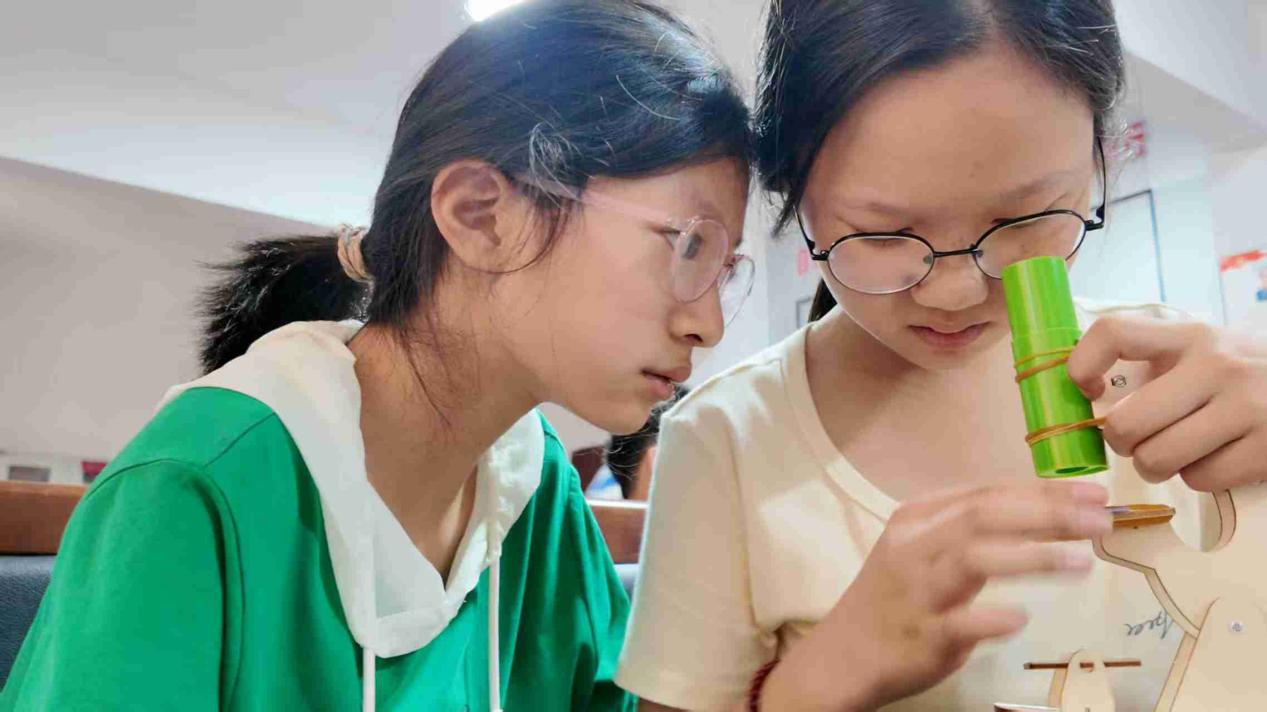 这堂看得见摸得着的显微镜实验课,是由志愿者们精心选用牛皮纸筒、凸透镜片、简易调焦旋钮等安全、低成本材料,并打磨处理。正是这些亲手制作的教具,让复杂的科学原理变得直观可感,为乡村孩子打开了观察微观世界的第一扇窗。