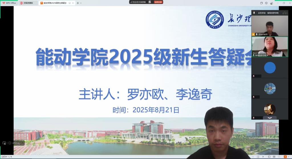 为了更好地迎接2025级新生的到来,帮助同学们顺利开启大学生活,8月20日以来,能动学院举办了四场2025级新生线上答疑会。本次会议由学院2025级新生辅导员李逸奇主持,新生辅导员罗亦欧、2025级下班党员、下班团干及全体新生共同参与。