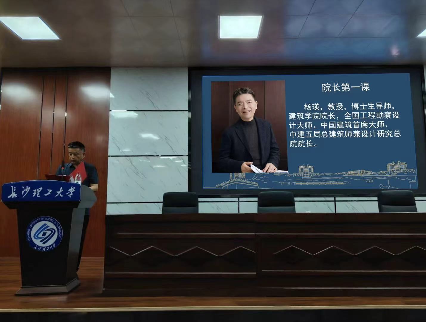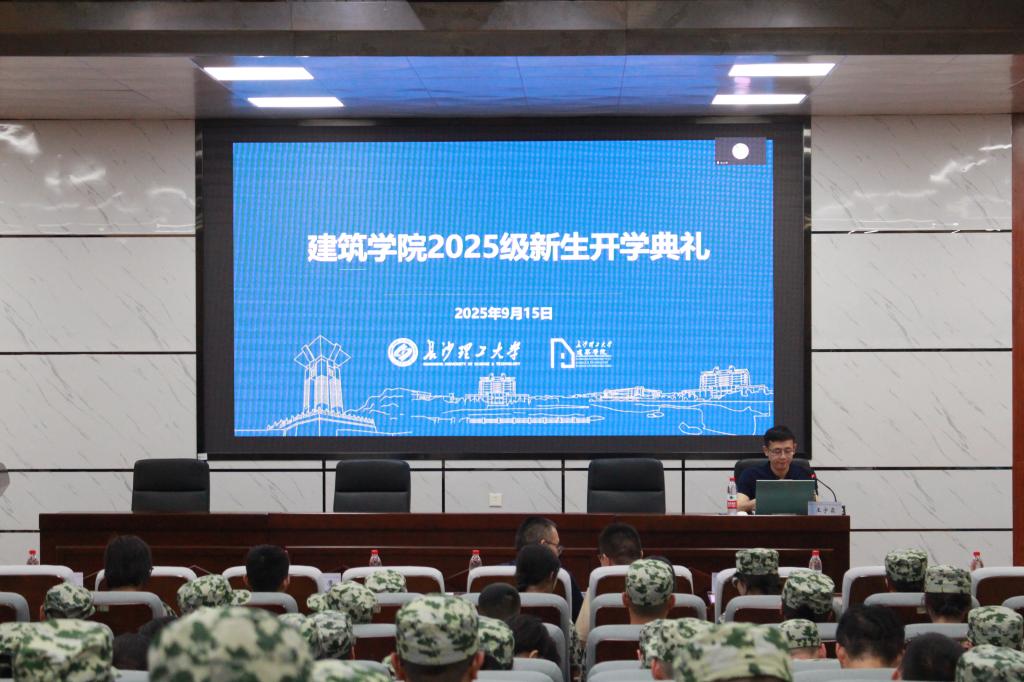 9月15日晚,建筑学院2025级新生开学典礼暨院长第一课在金盆岭校区4号教学楼报告厅举行。建筑学院特聘院长杨瑛、党委书记熊鹰、常务副院长许建和、党委副书记肖义慧、副院长周晨、副院长吴荻子、2025级新生班主任、全体学工人员、校友代表黄皓,以及全体2025级本科生参加典礼,典礼由2025级新生辅导员王宇霖主持。