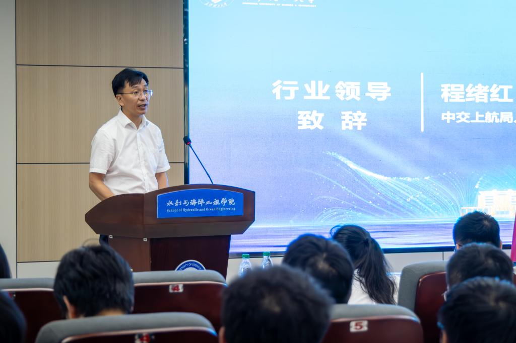 程绪红在致辞中表达了上航局对校企协同育人和水利水运人才高质量发展的高度重视,嘱托同学们要热爱行业、热爱生活、不忘初心,在加强团队合作和提升解决问题能力等方面持续发力,在攻坚克难中实现个人价值与行业发展的同频共振。他表示上航局及旗下13家子公司将为同学们提供全面、可靠、高效的研究与实践场景,欢迎同学们赴上航局及旗下企业开展学术交流、实践实习和就业入职。