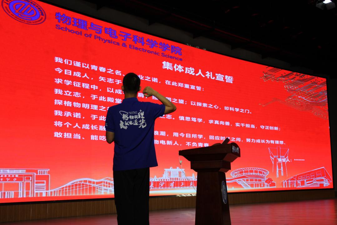 典礼最后,全体新生进行了集体成人礼宣誓,铿锵有力的誓言回荡在礼堂上空,展现了物电新生昂扬的精神风貌和坚定的理想信念。此次开学典礼不仅是一场欢迎仪式,更是一堂生动的“开学第一课”,为2025级新生的大学生活指明了方向,注入了动力。新生们将在这里扬帆起航,追寻科学之光,书写青春篇章。