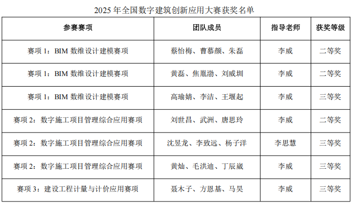 11月3日,由中国建设教育协会主办,国家数字建筑行业产教融合共同体及广联达科技股份有限公司联合协办的2025年全国数字建筑创新应用大赛全国总决赛获奖名单公布,能动学子荣获全国二等奖3项、三等奖4项。