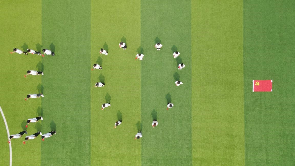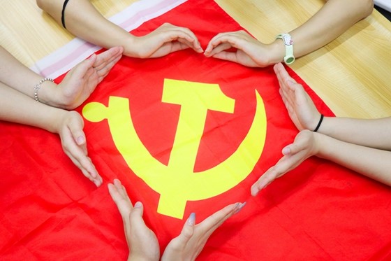 党员们手持红旗,深情呼喊“我爱你,中国共产党”。