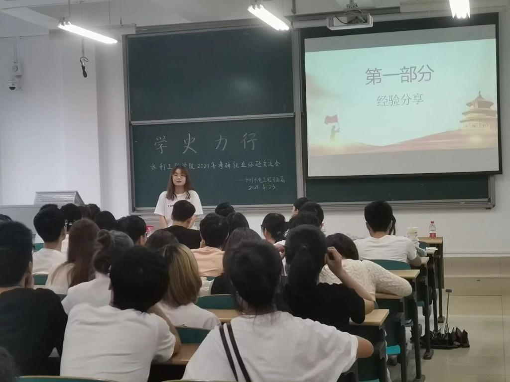 6月23日晚,水利学院在工三A216举行“学史力行”系列活动之水利水电工程专业考研就业经验分享交流会。由毕业生党员杨雪、汪华晨、谭威、陈冯洲、杨博威5位同学作主题发言分享,2018级、2019级水电专业学生参加。