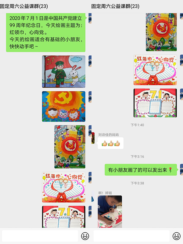 此次系列活动以红领巾,心向党为主题,10名志愿者以一带二的方式为长沙市天心区云塘社区的20多个孩子们开展美育课程。志愿者为孩子们整理了课程表,制定了详细的教学计划,并根据每周教案进行教学视频的提前录制,保证志愿者在线辅导的及时性与高效性。活动一经启幕,便收到了不少家长与孩子们的响应,孩子们充分发挥自己的想象力,拿起手中的画笔绘出了心中的党和祖国。小朋友们在群里纷纷晒出了自己的作品,志愿者们也对小朋友们的作品提出赞赏与点评。
