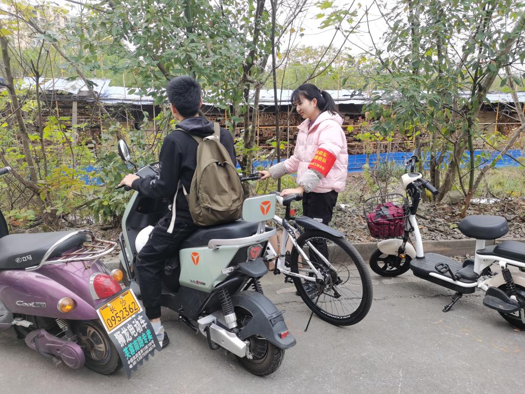 志愿者们戴着“非机动车引导服务队”红袖章,在服务区域引导同学们将电动车停放到规定位置并摆放整齐,并提醒大家遵守学校电动自行车专项整治的要求,做好在指定位置悬挂合法有效的号牌、佩戴好安全头盔、自觉遵纪守法、文明行驶等事宜。在与同学们的交流中,志愿者们遵守工作纪律,以良好的态度,耐心、细心地引导和协助同学们进行电动车摆放,让道路进一步“开阔亮堂”起来。
