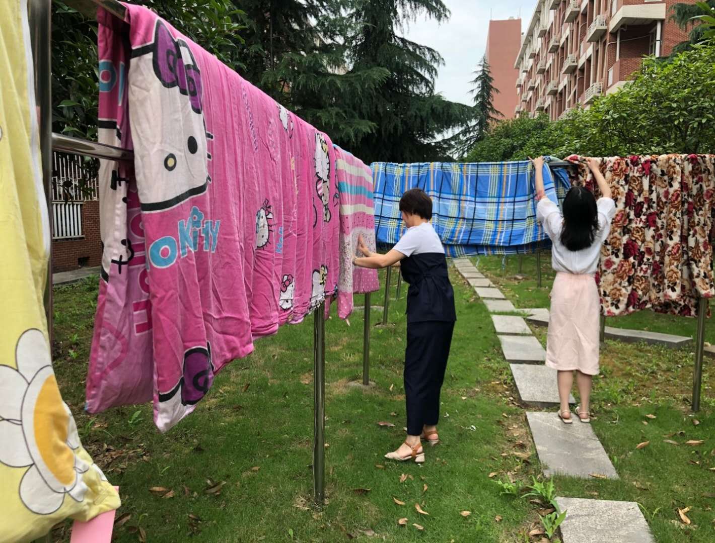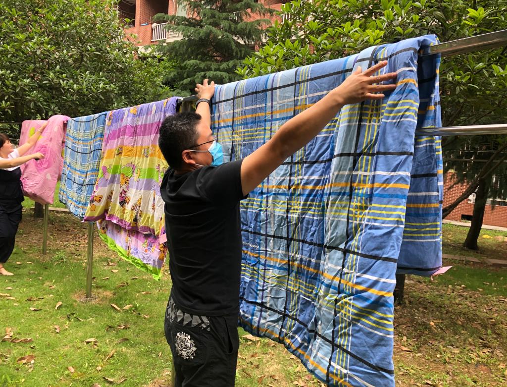 在了解到学生们的诸多挂念之后,材料学院辅导员、班主任纷纷开启接单工作,为学生提供各类暖心服务。近日,学院党总支副书记唐青和辅导员就走进了各栋学生宿舍,在宿舍管理员的热情协助下纷纷开启工作模式。“C116的同学们说请帮忙通风、C109的同学们都需要晒被子,唐青对照着清单核对各寝室的需求,精准服务。为防止被子晒后放错位置,老师们做好了充分的准备,逐一在被子上别上信息签,楼栋区、宿舍号、床位号等信息一目了然。完备之后就把做好标记的被子扛到楼下晒太阳,公寓的公共区域都变成了大晒场。副院长陈曙光作为毕业班班主任也热情地加入到为班级学生晒被子的阵营中,他边怕打着被子边说同学们回去之前都把宿舍卫生作了清扫,尽管长时间没进入了,但也没啥异味,把被子给他们晒晒,去去潮,等回学校了就可以盖有阳光味道的被子了