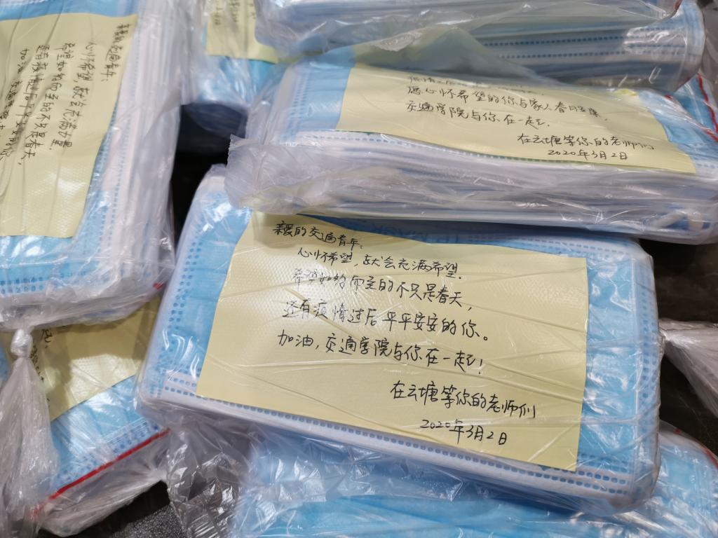 心怀希望,就会充满力量。希望如约而至的不只是春天,还有疫情过后平平安安的你。加油,交通学院与你在一起!随同口罩一起的还有老师们一笔一画写下的温馨小纸条。短短几句话,传达了学院老师们对湖北籍同学们的深情牵挂。