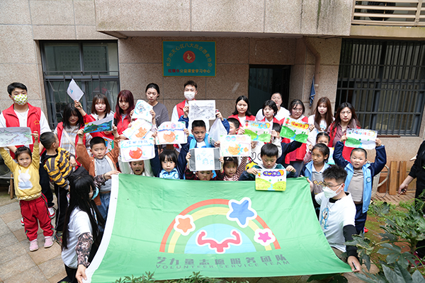 小朋友们手举画作,脸上洋溢着收获与骄傲,在一片欢声笑语中进行合影留念。活动依托“美育课堂”创新力优势,为传递护河理念赋能。在培养孩子绘画创作力的同时强化其爱河、护河习惯的养成,增强了社会实践活动的专业性,成功打造具有学院美育文化特点的公益课堂。