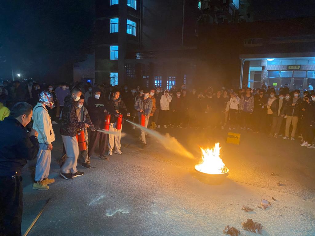 “大家在使用灭火器时,一定要注意‘提、拔、握、对、喷’五个重要步骤,特别是要注意使用前拔掉保险销,距离燃烧区域2米左右的位置,朝着火焰根部喷射……”消防演练结束后,保卫处消防科易国安就灭火器在面对不同火种时应当采取何种灭火措施进行了详细讲解,并邀请同学们现场实操使用灭火器。