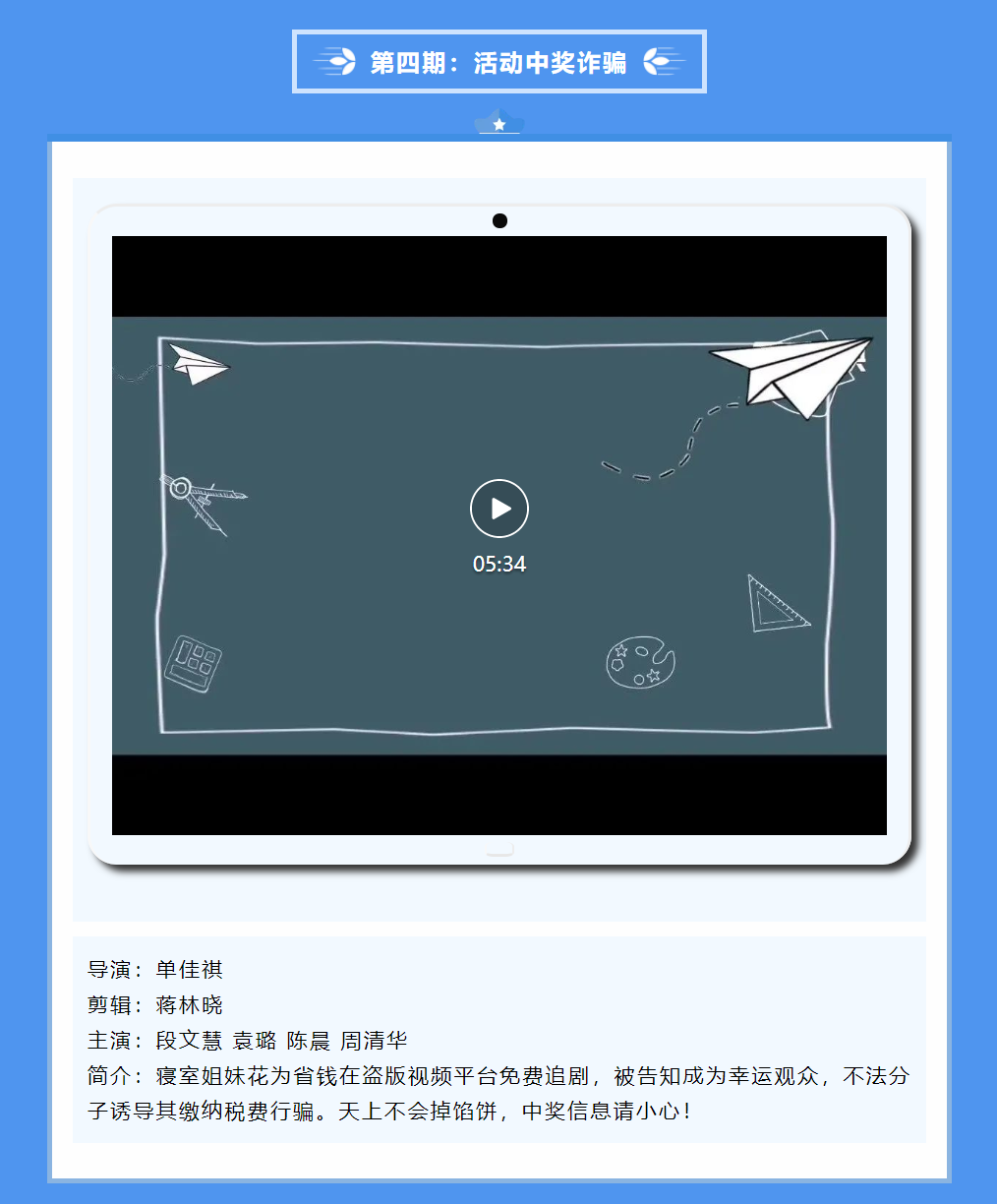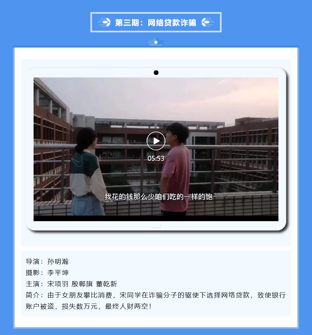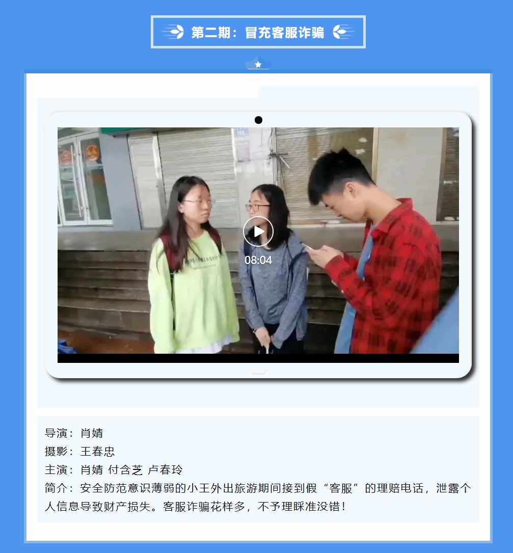 为全面提高学生对各类电信诈骗案例的鉴别能力,营造更加稳定、平安的社区环境,交通学院特此开展“护航青春平安社区,献礼建党一百周年”微电影创作大赛,在丰富同学们社区文化生活的同时,切实提高自身防范意识。