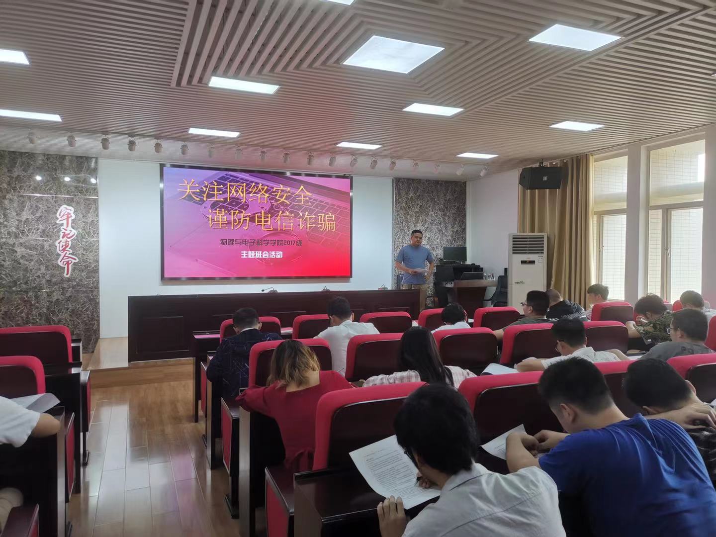 5月6日下午,物电学院在理科楼B413召开2017级防诈骗安全教育大会,大会由2017级辅导员赵俊程主讲,2017级全体本科生参加。
