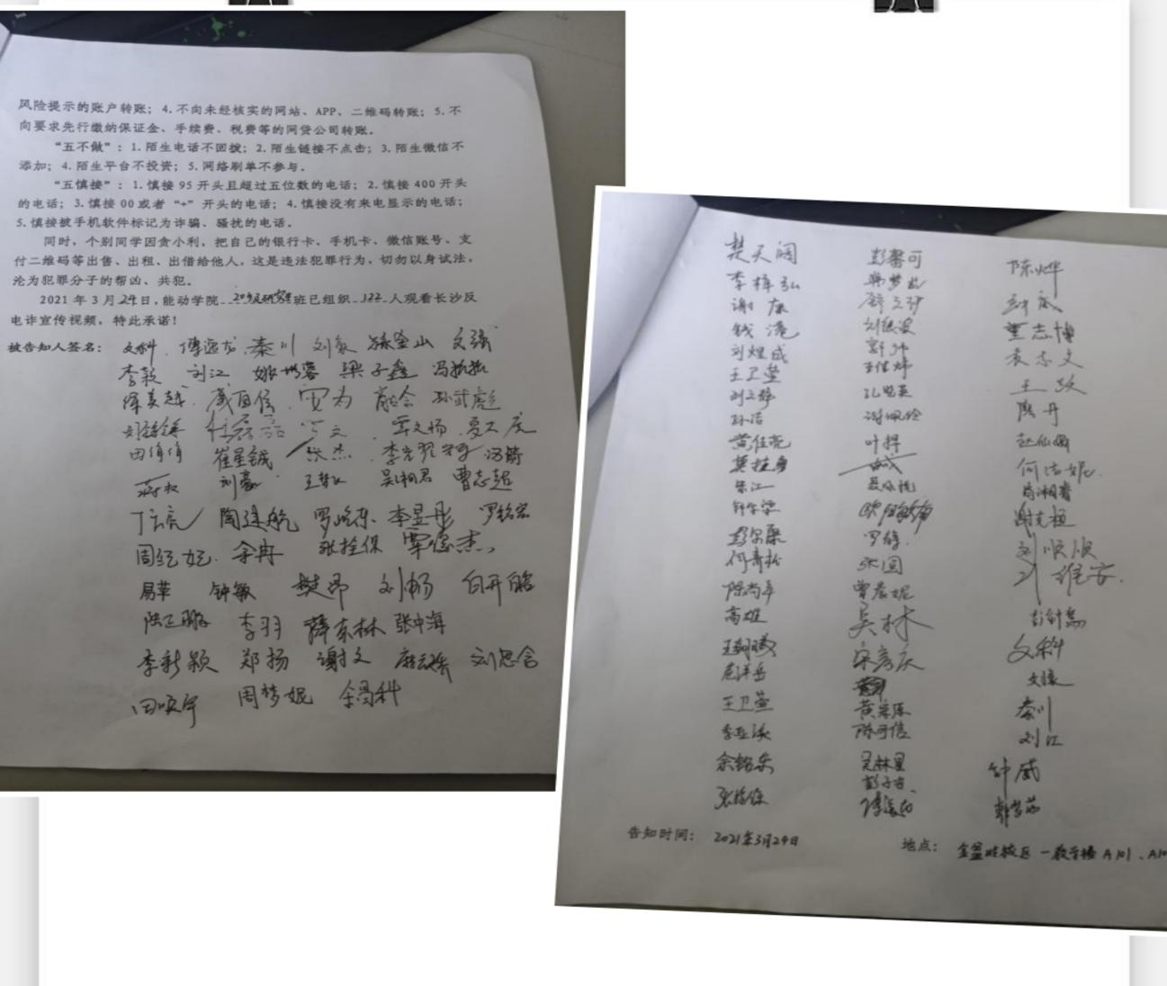 20级研究生召开了“牢记安全教育,谨防电信诈骗”为主题的班会。会上组织同学统一观看了10个宣传视频,并且向每位同学发放了“防范电信网络诈骗”宣传单。班会结束后同学们逐一签署《防电信诈骗告知书》。18级、19级研究生以课题组、工作室、寝室为单位,认真观看了防诈骗视频。此外也有同学通过自身的受骗经历警示大家,天上没有掉馅饼的事,唯有踏踏实实做人做事。辅导员及学生骨干还将“防范网络电信诈骗”宣传海报张贴到每间寝室、工作室,给同学们线下宣讲了防诈骗知识,提醒同学们认真阅读防诈骗宣传单及案例,同时还依托“能研会道”微信公众号开辟专栏,定期推送防范网络电信诈骗相关信息。