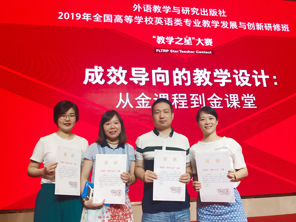 8月1—2日,外语教学与研究出版社2019年“教学之星”大赛全国半决赛在武汉举办,全国高校近700位英语类专业教师齐聚一堂,或参赛、或观摩、或研讨。永利官网外国语学院外国语言文学系姚尧、毛岚、孙文娟、胡伟组成的团队作为湖南省唯一代表队,参加角逐,努力拼搏,荣获全国半决赛二等奖。